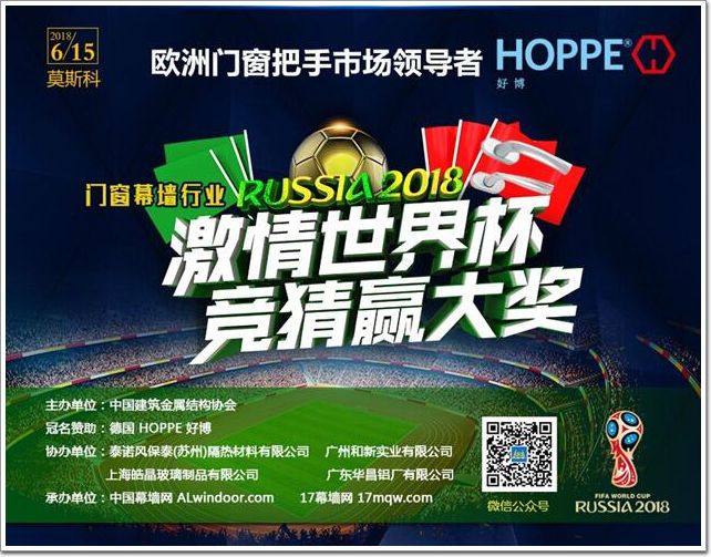 門窗幕墻的行業的精英們,在房地產行業調控背景下,市場競爭加劇,特別是近年來經濟下行壓力增大時,我們的出差多,會議多,大部分的時候都在忙碌中渡過。在收獲個人成長、事業成就、行業友情的同時,留給自己安排的時間卻越來越少......足球,充滿激情,而且往往能給人驚喜,相信這是很多職業經理人年少時的光榮與夢 想!今天,“他”就在身邊。為豐富門窗幕墻行業人士的看球文化,由中國幕墻網 ALwindoor.com 發起,來自德國的“HOPPE 好博”特約冠名的“2018世界杯”競猜贏驚喜活動,將于2018年6月14日至7月15日火熱進行,32支球隊,64場激烈賽事,讓您的行業生活不再單調!