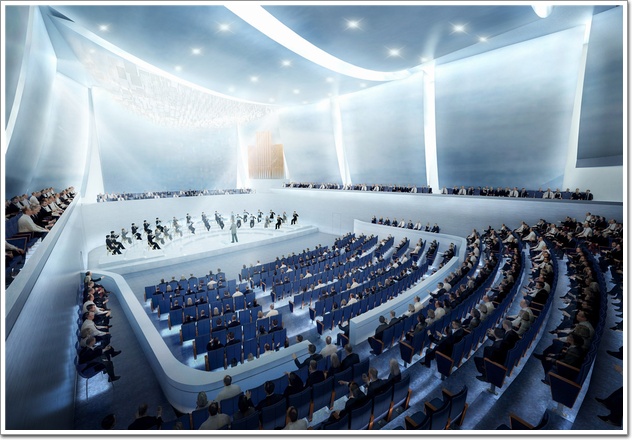 為解決大劇院常有的人流交叉的難題,建筑師將建筑主體置于5米高的公共平臺上,不同體量的觀演大廳互相組合,形成不同的室外空間。整體建筑略微向西北方向傾斜,將視覺通廊通向隔河遠觀的行政中心,同時引導夏季盛東南行風并避開了冬季盛行東北風。
