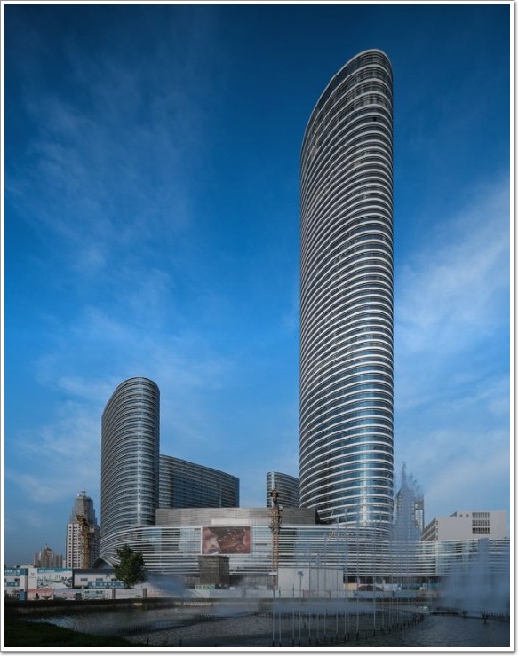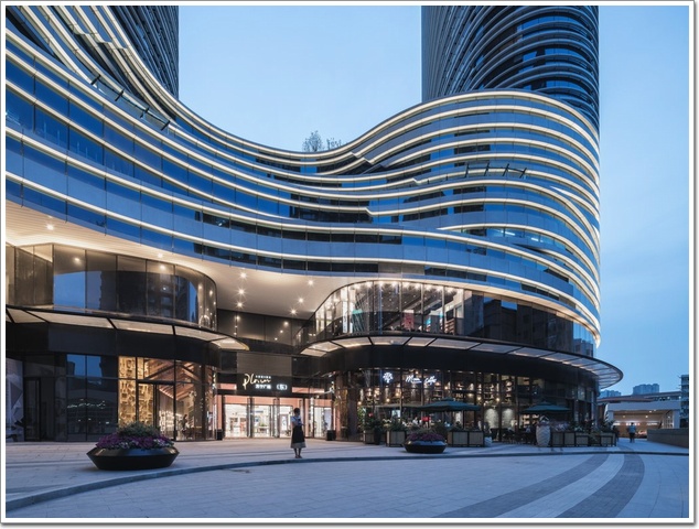 在外立面方面,以平滑的弧形立面為主,避了尖銳的棱角,形成彼此柔和、環狀上升的積極態勢。其次,部分外立面采用LOW-E全玻璃幕墻,整體造型追求簡潔明快、流線的建筑風格,裙樓與塔樓設計上呈現出流暢、平滑的視覺感,意在營造濃厚的商業氣氛。立面上以水平線條為主,強調環狀上升的趨勢,平面流暢的線條使得視線隨建筑造型無限延伸,這使得塔樓具有良好的視覺美感,現代感十足。橢圓外形加曲面幕墻,氣度不凡,盡顯奢華本色。