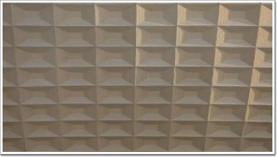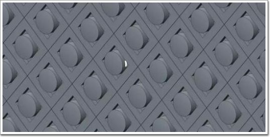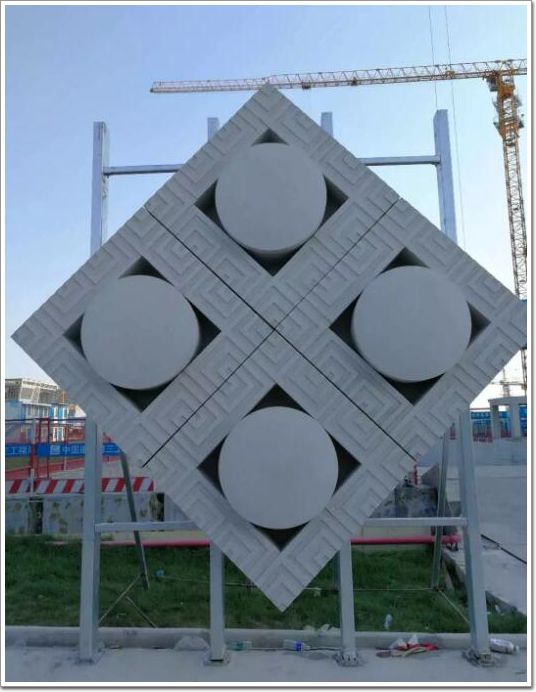 在宏觀造型上為變半徑圓弧相切,在微觀上造形更為復雜,整體呈現為菱形狀,但菱形中部為球面圓柱體造型,輔以象征中華傳統文化的“回形紋”路,使得GRC板塊整體造型莊嚴大氣,同時也增加了單個板塊的加工復雜程度。