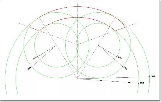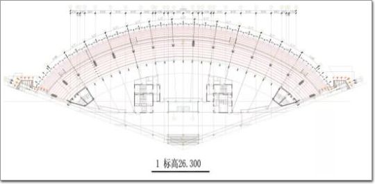 該項目整體平面呈現為橢圓造形,其中東西兩側立面弧線線長都為107米,立面在宏觀上是由半徑分別為62858mm與126583mm的圓弧于1-10軸和1-23軸線處相切而成,如下圖所示: