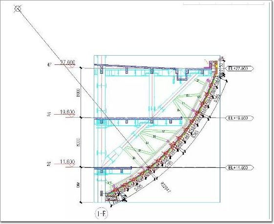 除此之外,我們還結合三維模型對現場進行交底,方便一線工人的理解,但鑒于三維操作要求較高的困難,我們又將這些他們理解后的構造關系及數據全部轉換為二維圖紙和具體的標注,其中包括每一根橫梁的位置尺寸布置圖以及每一個高度分格所對應的多達17張平面圖,這些數據共同保證了現場一線工人的準確理解和正確合理的材料加工及施工安裝。