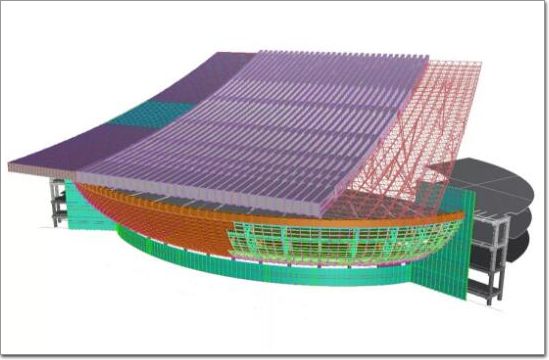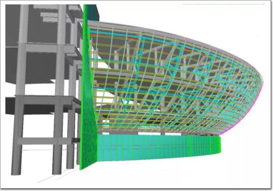 31榀鋼桁架及兩側的鋼網架組成,中間有鏤空鋁板造型,復雜的桁架及網架腹桿叢生,規格各異,如何運用最少規格的材料來適應不同規格主體鋼架且能避開復雜的腹桿是擺在面前的第一道難題。此外,“綖板”前后懸挑出結構近三十米,最高處達67.8米,這里如何施工也是擺在眼前的一個巨大難題。