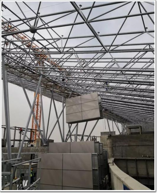 ④ 鋁板屋面,這個要說一下,鋁板是和鋼結構進行預裝,以裝配式的形式進行提升安裝,部分位置還要進行橫向運動就位,最大提升的屋面結構板塊尺寸達到9米×4米×1.4米,重量超2噸。