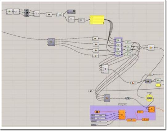 因屋面造型鋁板在高度和寬度上同時漸變,導致鋁板和玻璃的尺寸很難在二維圖紙中精度表達,為克服該問題,我們采用了行業較為成熟的RHINO+GRASSHOPPER的BIM參數化軟件較好地解決了該問題,批量生成加工圖及其對應數據,極大地減少了設計下料的工作量。