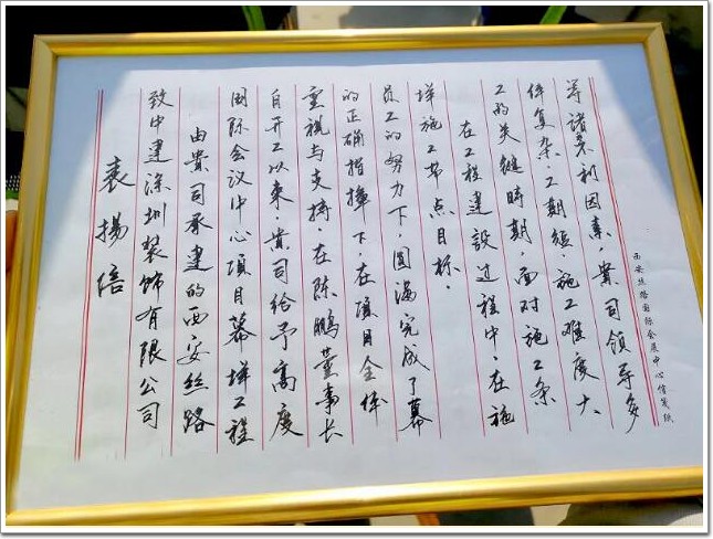 活動最后,業主單位燕現軍、黃淑生分別向中建深裝幕墻分公司執行經理江益、西安絲路項目經理梁勇授予搶工表彰錦旗和表揚信,在場單位代表共同澆筑象征著收獲的流金沙,慶祝幕墻工程節點完美亮相。