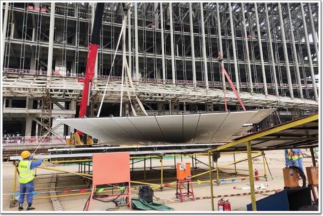工期又壓縮近兩個月,面對工期緊、交叉作業多,作業環境復雜等問題,項目團隊創新采用高空吊裝技術。幕墻玻璃和金屬鋁板、鋼吊柱總重12100噸,相當于195架波音737重量,一塊塊安裝不現實,如果采用裝配式施工,對單元體進行預拼裝,將大大提升施工效率。由于幕墻單元體結構弱,如何才能更安全高效的吊裝呢?