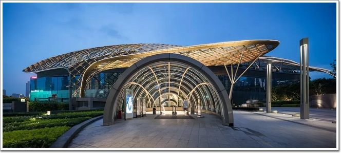 “雙鯉魚”頂部天幕由網狀的鋼結構材料組成,分別形成2張金銀兩色的鋼結構(詞條“鋼結構”由行業大百科提供)網,從遠處看神似魚鱗,兩層的魚形樓環繞中央花園而建,通過人行天橋連接,左右對稱,自帶靈動的韻律美。