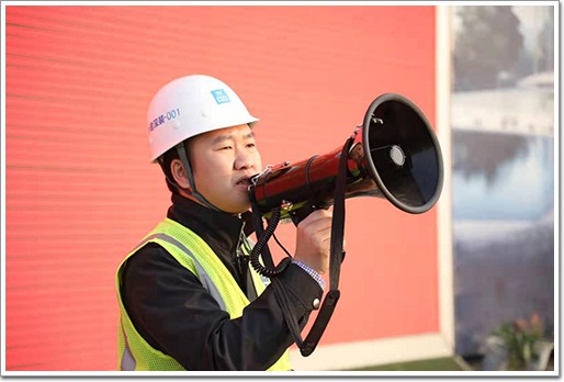 圖:西安絲路國際會議中心幕墻項目經理、紅細胞工作坊坊主梁勇每天帶領施工人員進行班前安全教育喊話