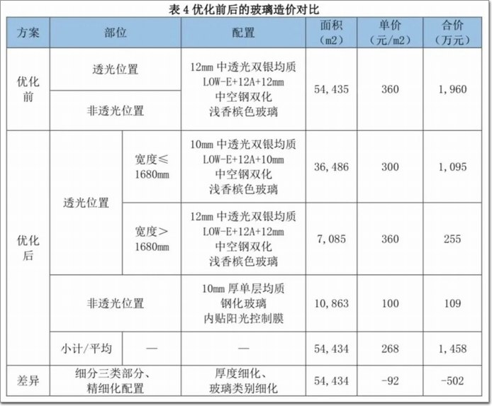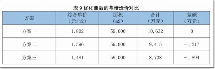 優化后,本項目玻璃幕墻方案節省造價1894萬元,優化降低比例約18%。見下表9。