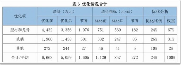 綜上分析,經過對幕墻結構、玻璃及細部的優化,在滿足功能及立面效果的基礎上,大大節約了造價,優化比例達到24%,其中型材和龍骨的優化節省金額占比67%,是主要優化內容。見下表6。