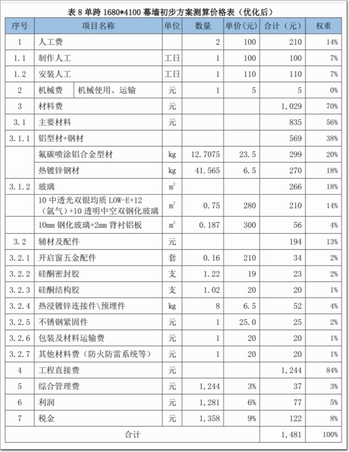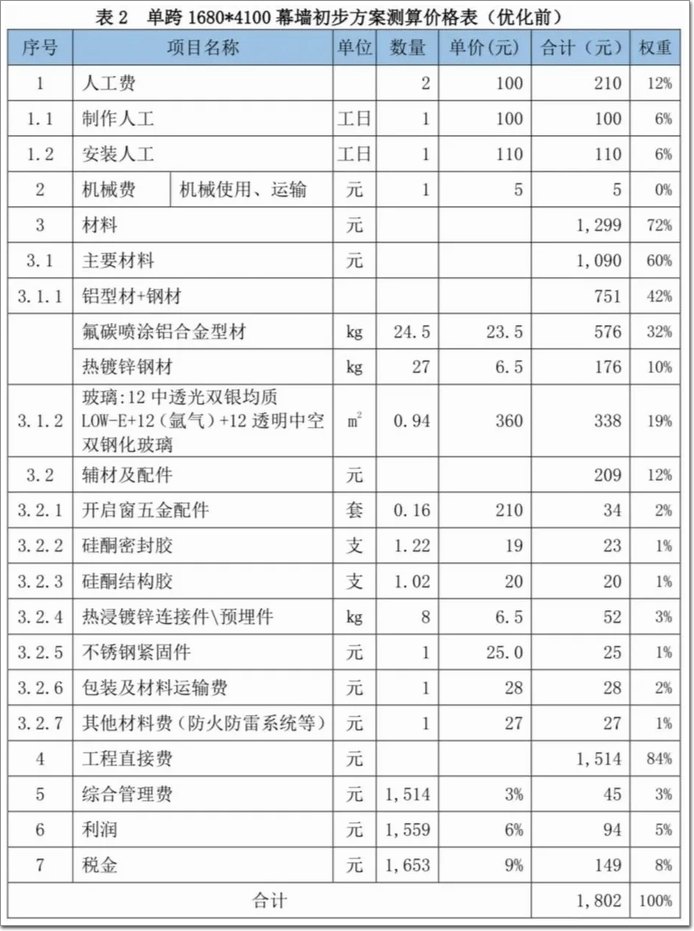 經測算,常規鋁型材立柱橫梁(詞條“橫梁”由行業大百科提供)的框架式幕墻系統綜合單方造價約為1802元/m2(表2)。