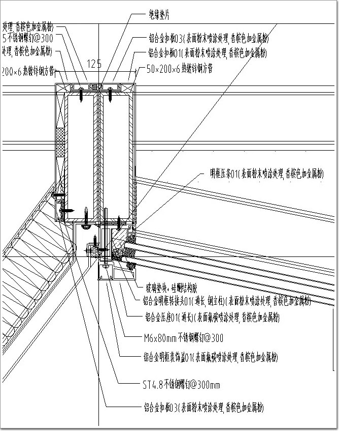玻璃幕墻層間非透光部位采用2.5mm粉末噴涂(詞條“粉末噴涂”由行業大百科提供)鋁襯板