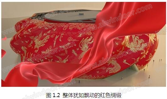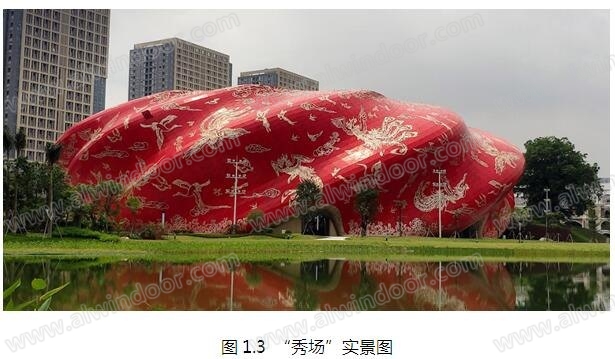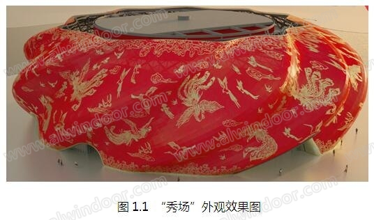 “秀場”彩繪鋁板多達14667件,約1.4萬平方米,花紋樣式達數萬種,每塊鋁板的尺寸及圖案均不相同;整體構圖飽滿、繁而不亂,遠看非常醒目,近看又精細圓潤,穿孔鋁板+豐富多變的表面圖案,為建筑“繡”出了一件色彩鮮艷、富麗堂皇的外衣。整個“秀場”建筑猶如一件不可多得的藝術品,這種獨特的形象將成為標志性城市雕塑。(圖1.3)。