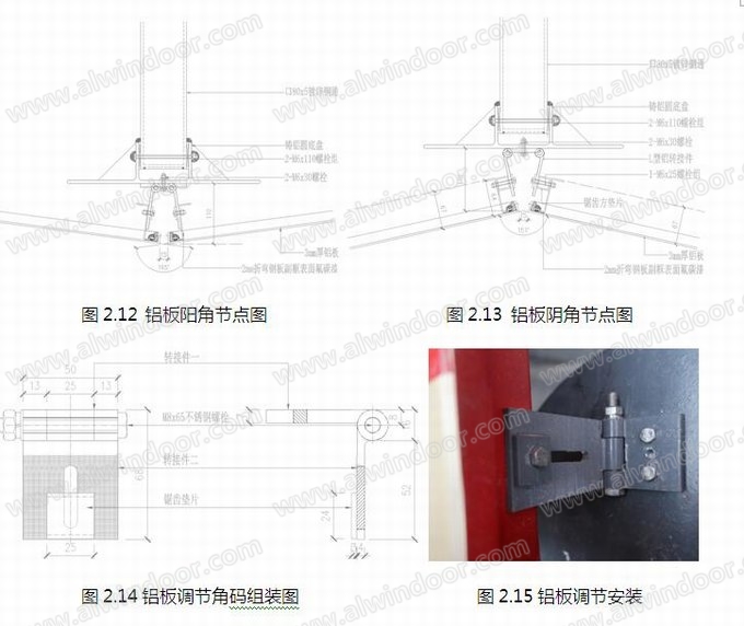三角形鋁板安裝前,以三個鑄鋁圓底盤為一塊鋁板安裝單元,鑄鋁圓底盤直徑為350mm,可滿足鋁板拼接端的匯集及L型鋁轉接件移動調節定位。根據鋁板安裝要求:(1)通過鑄鋁圓底盤與□80×5鍍鋅鋼方管之間20mm的安裝空間,可進行鑄鋁圓底盤的進出調節;(2)通過移動L型鋁轉接件完成鋁板安裝的初步定位;(3)L型鋁轉接件可自由轉動,通過繞轉軸方向轉動,完成鋁板繞轉軸方向的調節定位;(4)通過L型鋁轉接件的長圓孔,可完成鋁板的上下調節定位;(5)同時,鋁板可繞轉接件二上M6×25mm螺栓轉動,此部分定位完成后,鋸齒方墊片鋸齒與L型鋁轉接件鋸齒咬合固定(詞條“固定”由行業大百科提供),擰緊M6×25mm螺栓,完成整個鋁板的安裝調節。通過以上三維六向的鋁板調節定位,有效保證了鋁板的安裝精度,使其可適應雙曲面等異形金屬幕墻的應用。具體調節結合附圖A說明如下: