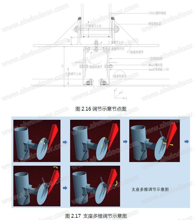 設置X,Y,Z方向坐標,鋁板安裝過程可進行如下調節:(1)鑄鋁圓底盤的進出調節(Y 軸方向調節±20mm);(2)移動L型鋁轉接件(X軸方向調節±20mm,Z 軸調節±20mm);(3)L型鋁轉接件可自由轉動(繞Z軸旋轉調節);(4)通過L型鋁轉接件的長圓孔(Y 軸方向調節±20mm);(5)繞轉接件二上M6×25mm螺栓轉動(繞X軸旋轉調節)。(如圖2.16~2.17)