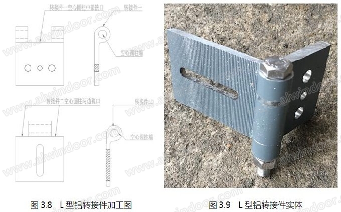 L型鋁轉接件一、L型鋁轉接件二直接配合,轉接件一空心圓柱中部銑口,轉接件二空心圓柱兩邊銑口,需分別控制其配合尺寸,保證其套接及滿足轉動的精度要求;空心圓柱的空心尺寸與標準的M8螺栓進行配合,保證其轉動順暢;鋸齒方墊片與轉接件二鋸齒的必須緊密咬合,滿足支座調節后的鋁板固定要求。(如圖3.8、圖3.9)