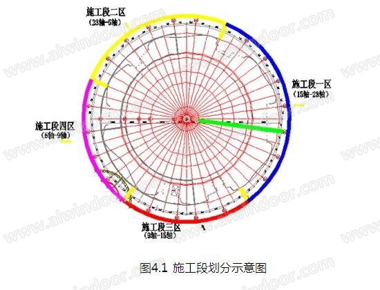 該項目主要為扭轉雙曲面鋁板幕墻的裝飾形式。為了保證施工工期具備更多的工作面,我司采取分段施工的方式進行,將整個工程分為4個施工段同時進行施工,即15-23軸為第一施工段,23-5軸為第二施工段,5-9軸為第三施工段,9-15軸為第四施工段。(如圖4.1)