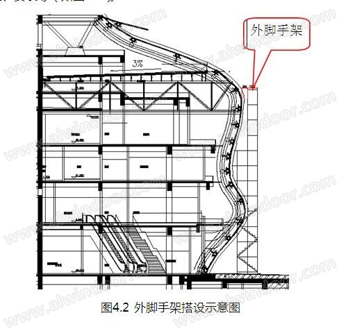 (1)標高0.000米至19.500米施工措施:搭設外腳手架作為防護并兼用于輔助施工人員進行幕墻龍骨及面板放線、安裝等(如圖4.2)。