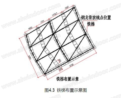 1)在主體鋼結構上鋪設可拆卸鐵梯(寬400mm×長4000mm)作為施工平臺輔助施工人員進行幕墻龍骨及面板放線、安裝等,每一道施工工序完成后鐵梯拆除移動到下一施工區域。