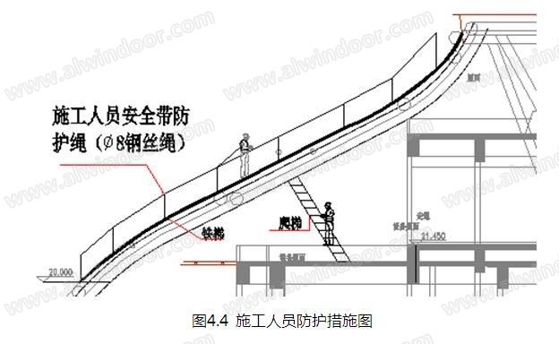 3)距主體鋼結構面1米處掛∅8鋼絲繩、作為施工人員安全帶防護。