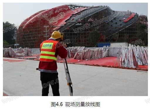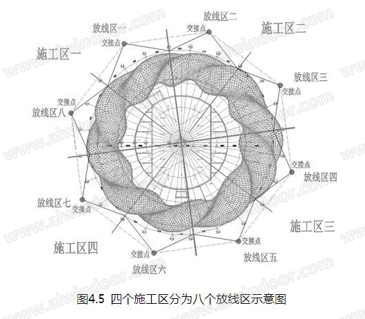 (1)將四個施工區劃分為八個放線區。本工程建筑高空作業面高度超過30米,作業面積大,單靠在地面上測量是無法完成的,所以必須在屋面搭設測量平臺,平臺搭設必須和控制點通視,采用后方交會,對屋面進行控制。測量過程中風、光、施工中的震動對測量實施都產生一定的影響,所以平臺搭設必須牢固,每2個小時交會一次并作記錄,在過程中減小誤差。大風、雷雨、雨霧、昏暗等天氣不能進行測量工作(如圖4.5)。