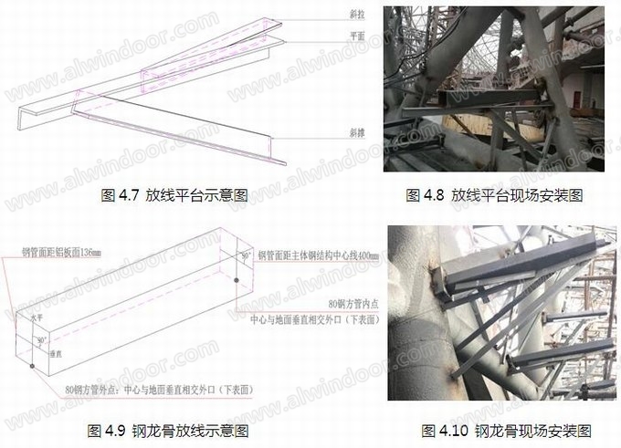 (1)在主體鋼結構上設置放線平臺,放線平臺由平面、斜撐、斜拉鋼件組成,放線平臺方向和高度根據全站儀定位調整。
