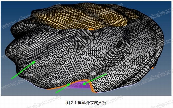 “秀場”的幕墻總面積約31000平方米,總高度:30.65米,幕墻系統主要有異形鋁板幕墻、玻璃幕墻、涂料、門等;“秀場”外立面為雙曲形狀,主要由造型各異的三角形彩繪鋁板構成,整體猶如飄動的紅色綢緞(圖1.2)。
