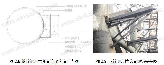 □80×5mm鍍鋅鋼方管為鋁板點支撐主龍骨,其一端通過14#槽鋼與主體鋼結構連接。安裝在主體鋼結構上的14#槽鋼開口兩端加4mm鋼板封堵,鋼板封堵前需確保槽鋼內部空間干燥,鋼板封堵與主體鋼結構接觸面密封膠封堵,形成完好的密封性能,防止槽鋼內部腐蝕(圖2.8、圖2.9)。