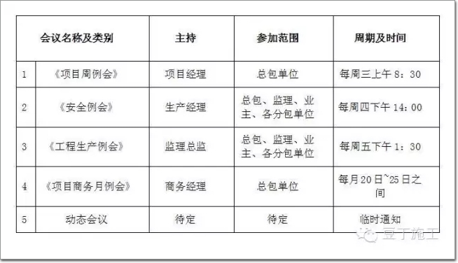 2)各類動態會議制度視項目需要隨時召開,一般情況下發起方將通過有效方式至少提前一天通知相關方。凡無故遲到者、無故缺席者進行處罰(有詳細處罰標準)。分包單位主要管理人員如遇到特殊情況無法參加的會議的,需向總包項目經理提交紙質假條。3)原則總包不向分包提供會議室服務,若特殊情況,需填寫會議室使用申請單,經總包項目經理簽字方可使用。