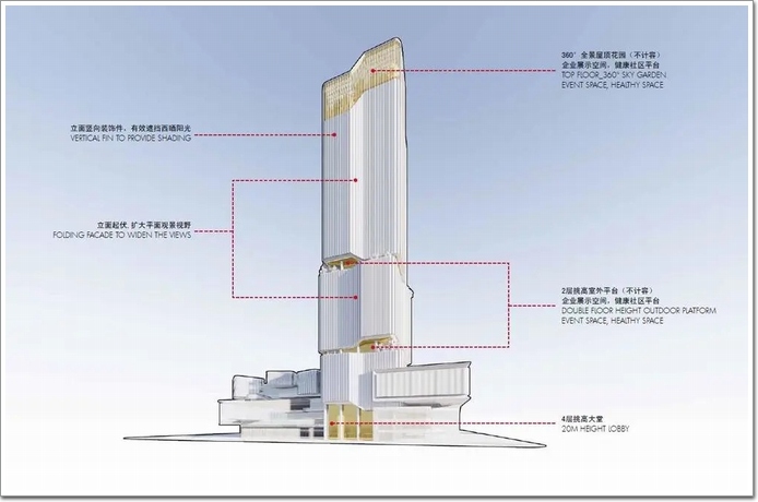 微弧的三亞灣和從海灘逐漸隆起、連綿不絕的丘陵與群山,塑造了三亞市極具特色的地方景觀。基地西面朝向海灣,距離海灘僅3公里,基地東、南、北三側為山脈環繞,緊鄰基地北側還有一處城區面積最大的東岸濕地公園。為了響應基地極佳的景觀資源和鮮明的地理特征,塔樓標準層在外輪廓的四邊微折,轉角無柱加弧形倒角的處理,以增加樓層景觀界面和最大化360度觀景視線;塔冠部分結合立面折疊進退,以高低錯落的動感造型進一步呼應三亞市“山海相連”的地域特征。同時,利用低中區的避難層,打造了兩個半室外架空層,在架空層上下,外輪廓折面左右鏡像,使得塔樓整體塑形更為豐富有機。兩個具有深重陰影的架空層,也正好是三亞熱帶海洋性氣候的外在表達。