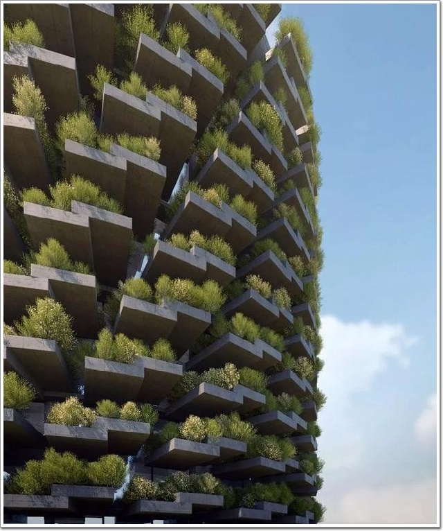 所謂“森林”,顧名思義目是形成一個“活表皮”,從而改善空氣質(zhì)量和學(xué)生的整體健康,讓整座大樓會“會呼吸”。扭曲的立面由一系列有韻律的凸出平臺和植被構(gòu)成,而繁茂的植被幾乎將整個建筑包圍,裸露在外的建筑實體部分很少,就更難看到現(xiàn)代化的玻璃幕墻的身影了。