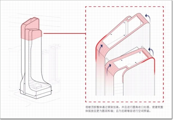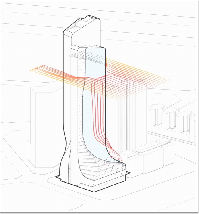 建筑結構的設計充分利用了建筑形態的力學美感,通過兩個互為支撐的建筑體塊與核心筒嵌入咬合的關系,與精確地控制建筑與核心筒的高寬比,強化了建筑結構整體的穩定性和抗風能力,同時營造了南北通透的使用空間。外立面和屋頂的曲面處理不僅有效的減少了高層的風壓荷載,而且讓整棟建筑較傳統的塔樓結構方式節省了大量造價。