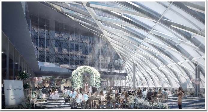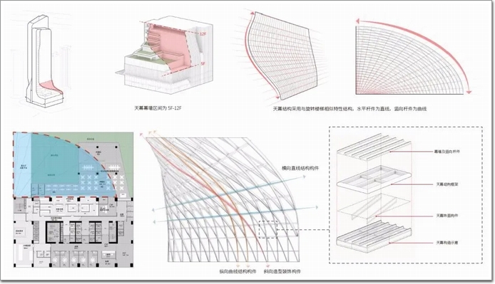 立面處理的另一巧妙之處在綜合體的塔樓和裙樓之間自然優美的過渡,在空中花園平臺與裙樓銜接的地方塔樓外立面順延而下,形成一個曲面的天幕造型,天幕之下形成了開闊的多功能空間,既可舉辦婚慶禮儀、亦可作為餐飲、展陳空間、創造了一個理想的公共活動場所。