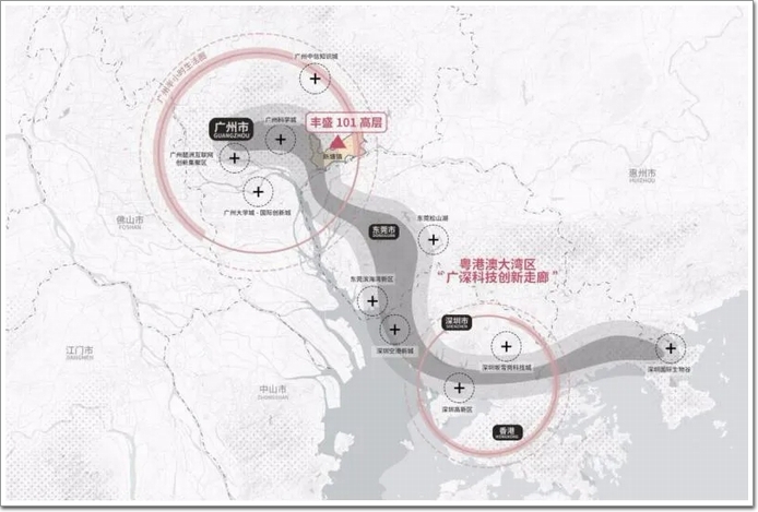 豐盛101項目位于廣州增城荔新大道旁,其北側遠眺南香山,南側遙望廣州珠江新城,坐擁粵港澳大灣區和廣深創新走廊核心區位優勢。該項目與周邊交通體系相結合,助力于大灣區一小時生活圈的建設。