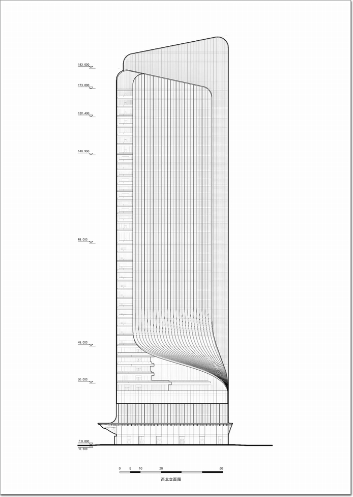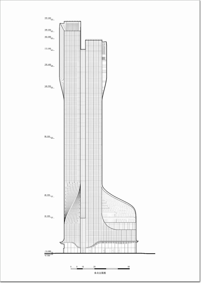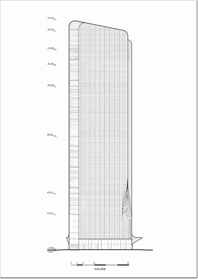 形態的生成以建筑核心筒為軸心,向南北分成兩個體塊,東西錯開一個柱跨,外立面以“帆”之理念塑造,順勢而下,輕盈落于裙樓之上,形成雨棚空間,巧妙地將建筑的裙樓和塔樓融為整體,以自然有機的形態點綴著城市的天際線。