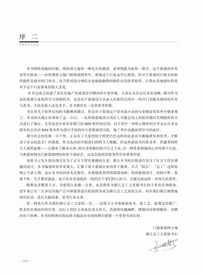 本書完成之初請了多位房地產及建筑設計圈內的專家審稿,大家認為其定位非常清晰:既可作為高校幕墻專業軟件學習的教科書,也是對于幕墻設計從業人員軟件應用中一些冷門功能及插件的開發與普及,不論是新人還是老手,本書都具有一定的參考價值。