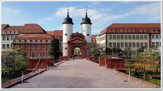 德國海德堡區(qū)參考德國具有最悠久歷史的海德爾堡大學的建筑風格,以紅砂巖外墻和傳統(tǒng)街區(qū)構成建筑群,布置在小山丘上細致而雄偉的城堡和網(wǎng)格狀的街區(qū)形成了鮮明的對比。