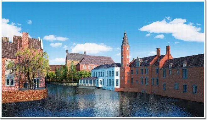 布魯日區(qū)參考比利時著名城市布魯日連綿小建筑物的街區(qū)特點,基地則結合紅磚外墻、階梯式陡坡屋頂?shù)韧庥^特征,以及獨具特色的鐘塔和拱形石橋設計,設計了與自然環(huán)境完美契合的街區(qū)空間。