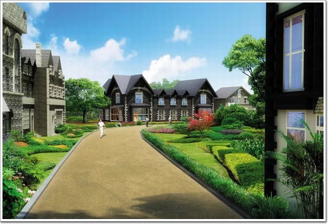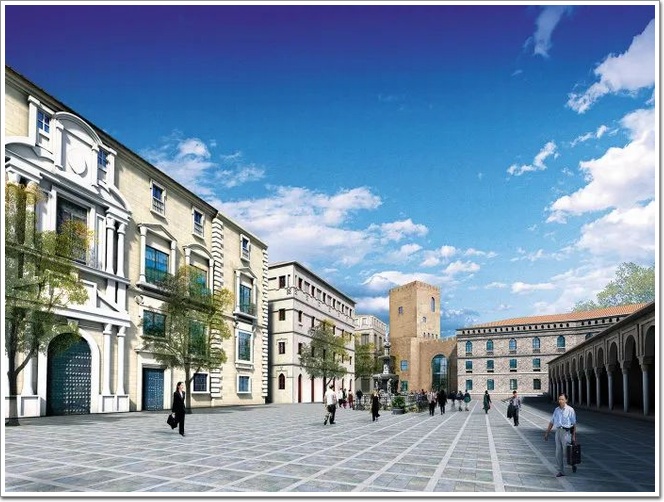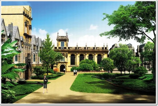 牛津區(qū)參考了牛津大學建筑風格,結合以灰色板石為材料的大坡度尖頂、米色萊姆石外墻、草坪里院和回廊,使整個街區(qū)都可以感受到猶如知識殿堂般的氛圍。