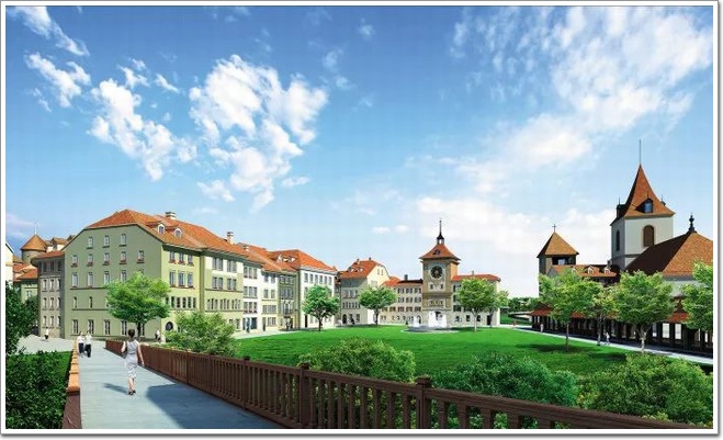 弗里堡從15世紀流傳下來的200多幢獨特的哥特式建筑賦予了這座古城無與倫比的中世紀風格魅力,弗里堡區(qū)根據(jù)用地起伏、靠近松山湖水域的地理位置特點,結合瑞士極具歷史性的古城和修道院建筑,通過棕紅色瓦斜坡屋頂和綠色砂巖外墻等特征,打造面向湖畔的斜面風景。
