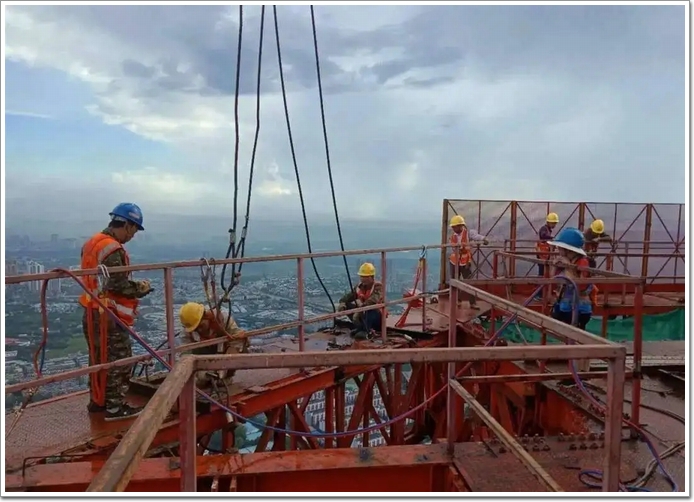 本次拆改共計主桁架12節(jié),次桁架66節(jié),撐桿34節(jié),總計約61.28噸。經(jīng)過20余天的緊張作業(yè),這項拆除改造工作圓滿收尾,標(biāo)志著蜀峰468順利進(jìn)入標(biāo)準(zhǔn)層施工,實現(xiàn)7天一層的快速攀升!