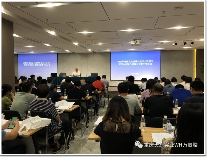 2020年9月3日“2020年度重慶區縣住房城鄉建設主管部門管理人員—綠色建筑與節能專項培訓會”在重慶市建筑技能中心0901會議室舉行。本次會議與會人員為各區縣(自治縣)住房城鄉建委(建設局)綠色建筑與節能工作分管負責人,承辦部門負責人和工作人員。重慶天旗實業有限公司(萬豪膠)作為被重慶住房和城鄉建設委員會、重慶市經濟和信息化委員會評選的重慶一星“綠色建材”,符合本次會的綠色建材,受邀參加本次會議、布展并參加了本次會議的分享。