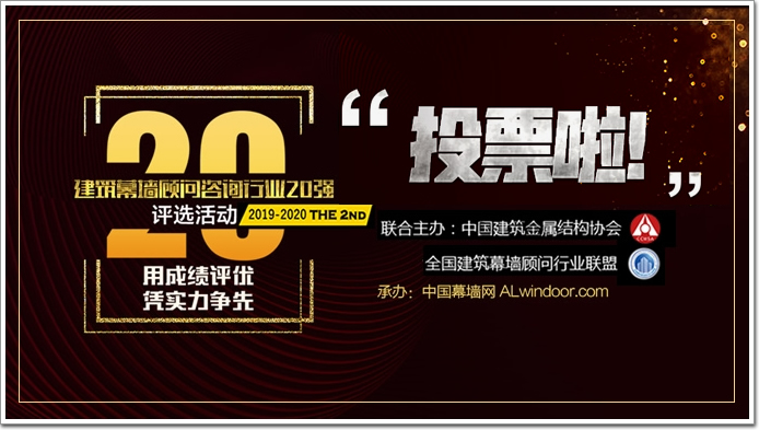 用成績?cè)u(píng)優(yōu),憑實(shí)力爭先|近年來,建筑幕墻顧問咨詢行業(yè),作為推動(dòng)幕墻技術(shù)進(jìn)步與創(chuàng)新、提高幕墻安全保障的中堅(jiān)力量,廣大顧問咨詢公司、設(shè)計(jì)院所在技術(shù)創(chuàng)新與工藝、流程管控等方面,創(chuàng)造了引人注目的成績。中國建筑金屬結(jié)構(gòu)協(xié)會(huì)鋁門窗幕墻分會(huì)與全國建筑幕墻顧問行業(yè)聯(lián)盟,共同舉辦“2019-2020年度第二屆建筑幕墻顧問咨詢行業(yè)二十強(qiáng)”評(píng)選活動(dòng)。