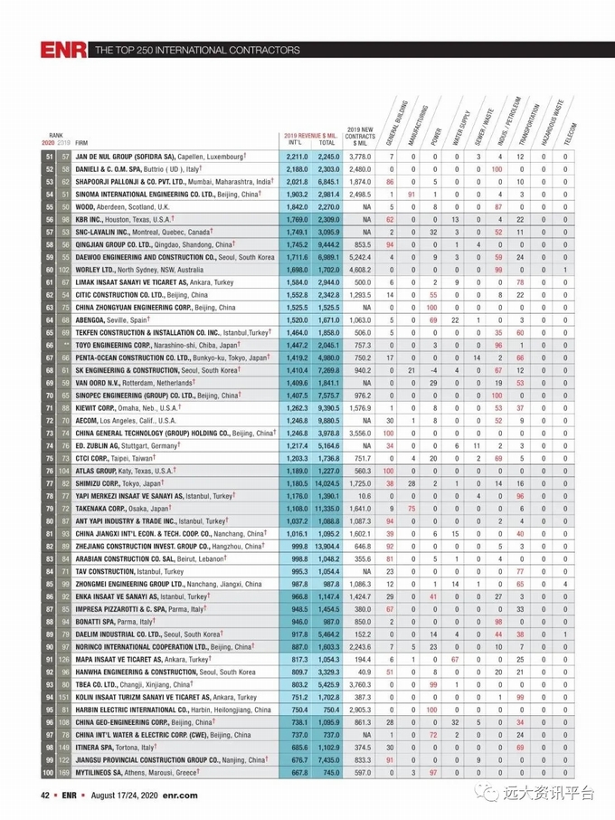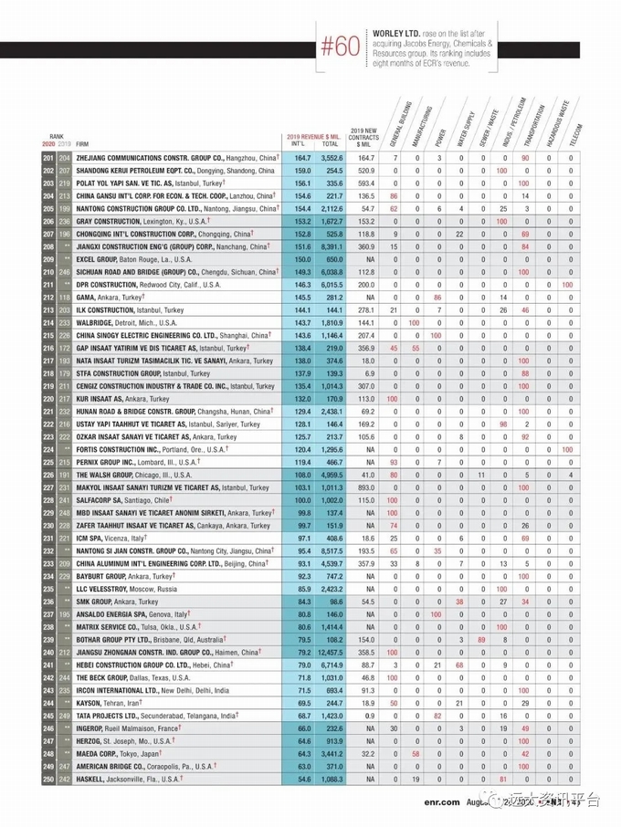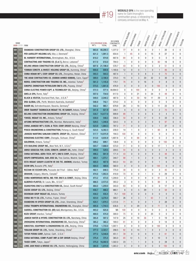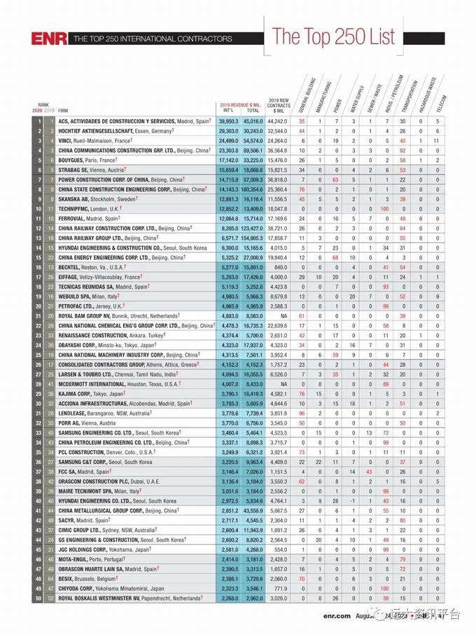 2020年度ENR“全球最大250家國際承包商”上榜中國企業名單如下: