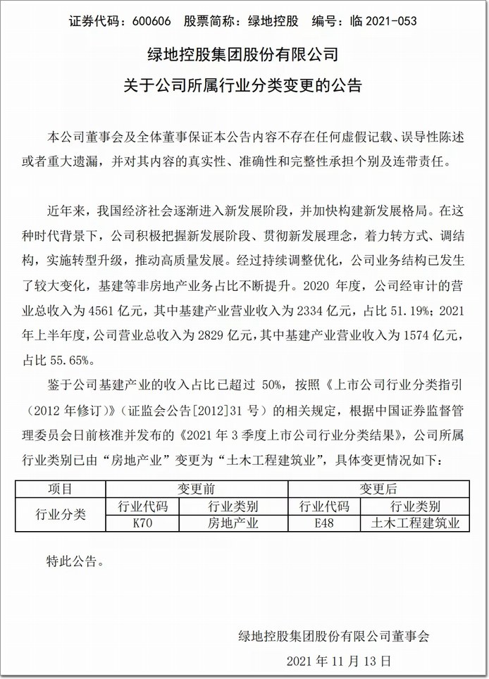 近日,綠地控股集團發布了一則令人大跌眼鏡的公告,宣布變更自身所屬行業分類,從“房地產業”變成“土木工程建筑業”。也就是說,綠地認為自己已不是一家地產公司,而是一家建筑公司。