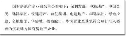 在一份行業盛傳的白名單中,保利、中海、金茂、華潤、招商、遠洋、金地等大型房企赫然在列,其他地方優質國企也在被支持的范疇。
