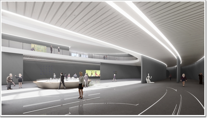該項目空間靈動感極強,建筑師充分運用漸變攀升的線條,營造出功能分區。成都奧體中心一共分為3層:一層是經營性空間,涵蓋整棟建筑的后勤、辦公、員工食堂;二層是展覽空間;三層是政務展廳。