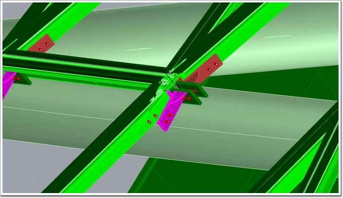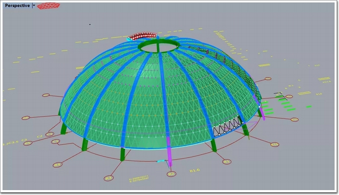 項目整體為球形玻璃幕墻,幕墻高度19.8m,幕墻面積約3750㎡。江河幕墻積極創新工藝,打破了穹頂幕墻傳統工法通過“經緯交錯”的鋼龍骨實現球形幕墻的做法。設計上對主體鋼結構進行優化,取消“經向”鋼龍骨,通過設置鋁合金“T”型幕墻龍骨及特制米字型鋼件再用螺栓連接,實現幕墻結構構造。
