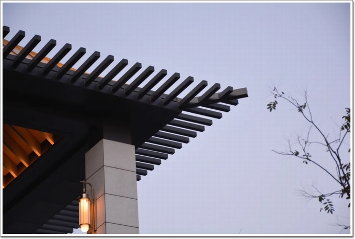 濃厚古典中式風格的攬月庭由金屬屋面、鋁板和金屬格柵線條系統打造,在此可極目遠望園林景觀。